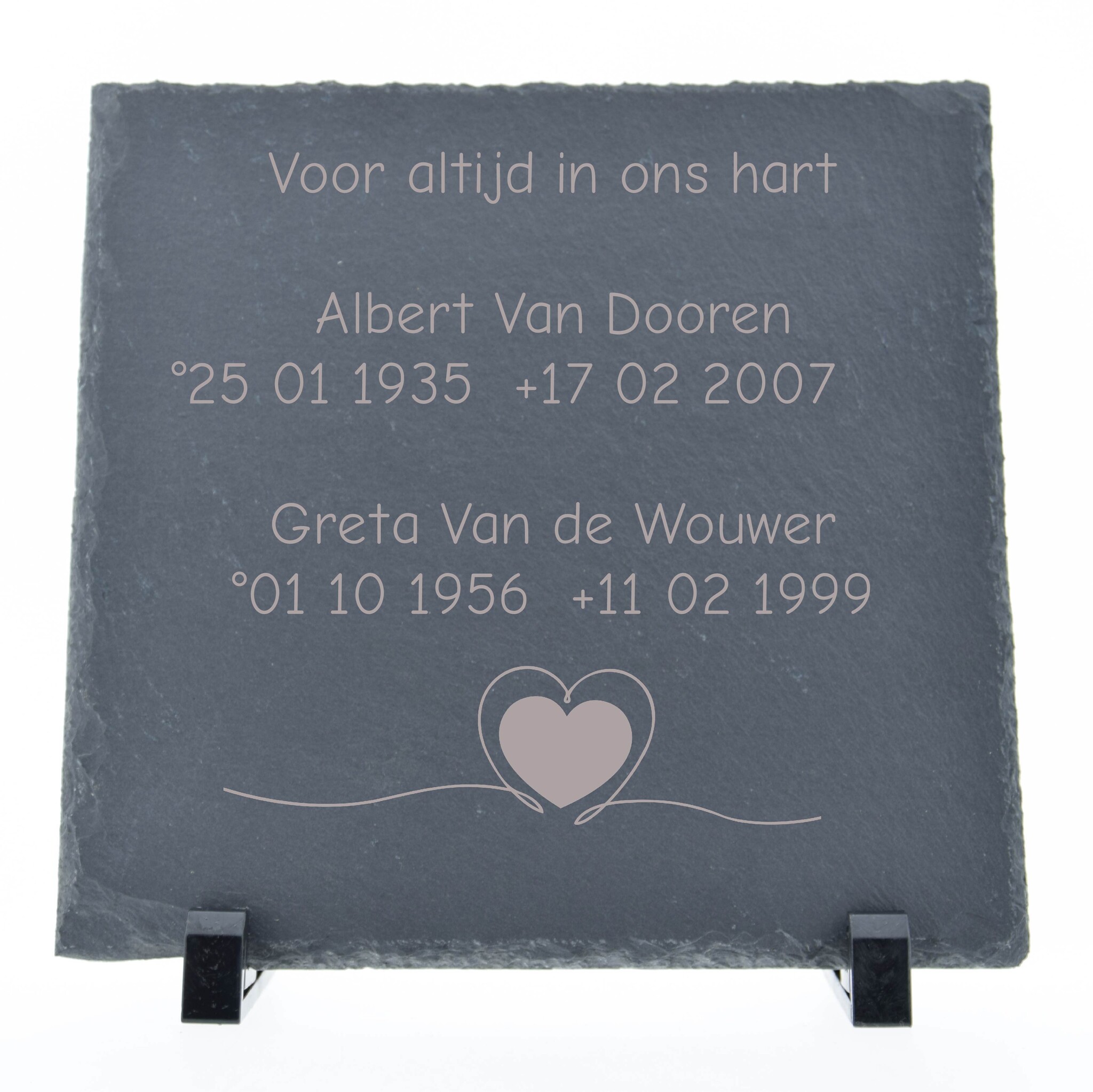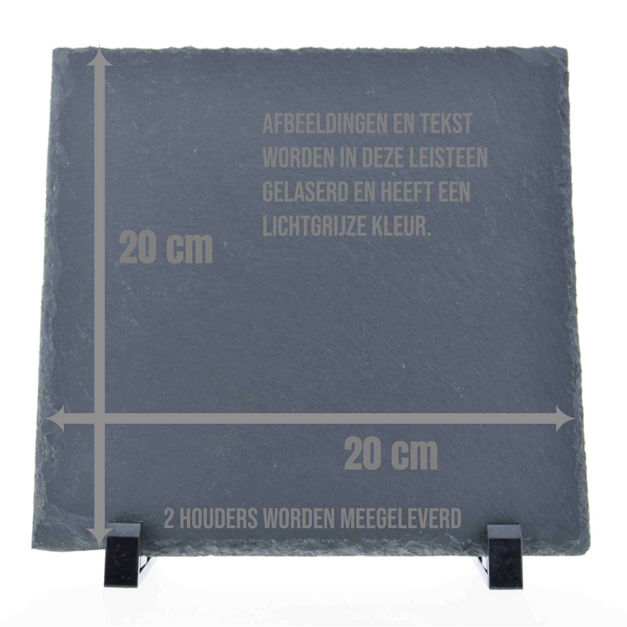 Ben je op zoek naar iets om een speciale boodschap in te vereeuwigen? Wil je een gedenksteen voor op het graf van je dierbare of wil je de geboorte van je kleintje, je trouw of een speciale belevenis vereeuwigen, dan is deze gegraveerde leisteen perfect. Met je eigen tekst en keuze uit onze illustraties, maak je een uniek en persoonlijk geschenk. Met onze personalisatietool gaat dit allemaal heel vlot. Maak een keuze uit onze verschillende lettertypes en kijk gerust eens tussen onze vele illustraties en maak je leisteen af.