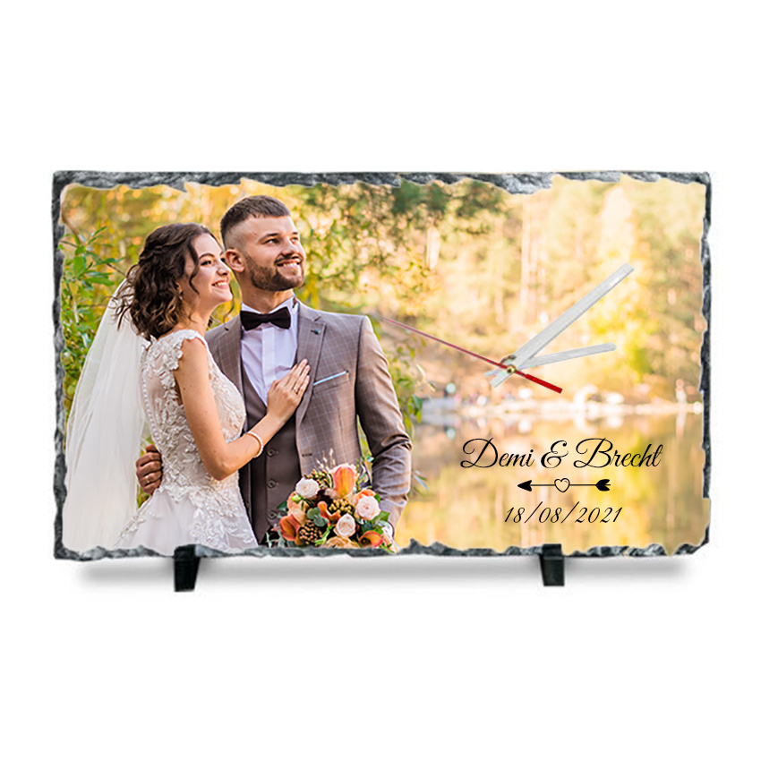 Deze rechthoekige leisteen is een natuurproduct met een decoratieve uitstraling. Elke leisteen heeft een natuurlijke vorm en textuur, om met trots uw dierbare foto te tonen. Doordat de leisteen telkens anders is, is iedere afdruk ook uniek. Zo wordt je leisteen een persoonlijk aandenken. Voor jezelf, een pasgeboren baby, een leuke dag die je wilt herinneren. Maar vrienden en familie zullen zeker ook heel blij zijn met zo'n uniek cadeau. Een foto van jou en je beste vriendin, een trouwfoto van je ouders, een foto van je hond,... het kan allemaal. Deze leisteen heeft een klok ingebouwd. Dat maakt je decoratief natuurproduct nog zoveel specialer.