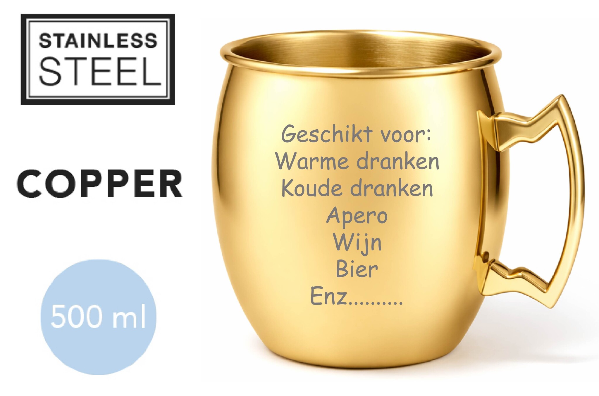 Stijlvolle cocktail- en mocktailbeker van 500 ml in roestvrij staal met een luxe gegalvaniseerde koperlaag. Perfect voor het serveren van frisse dranken en personaliseerbaar met naam of tekst, logo op aanvraag. Lees meer
